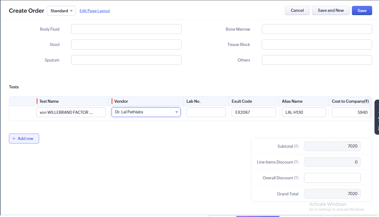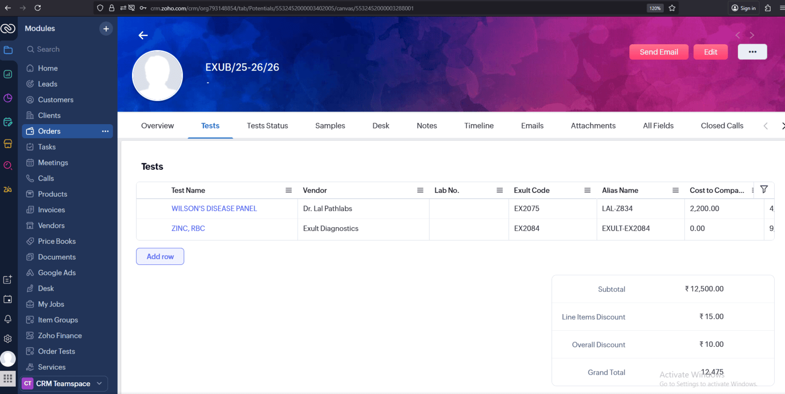 - Designed a custom module "Tests / Test Instances" to record each individual test(linked to orders and customers).