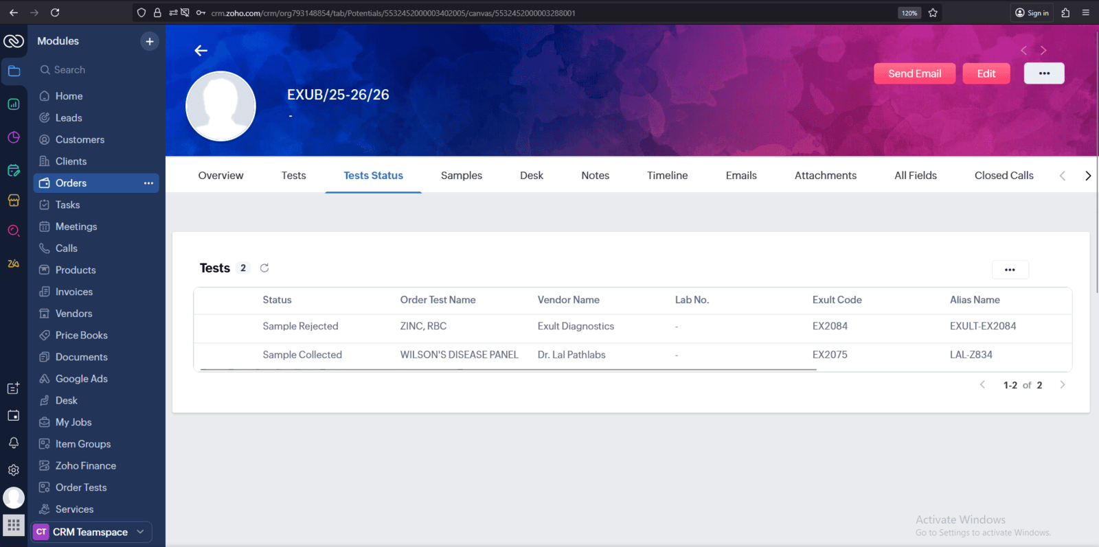 Exult Diagnostics offers lab tests, sample collection, health packages, and report delivery. Each order includes multiple tests, each with its own report generation date and status lifecycle.