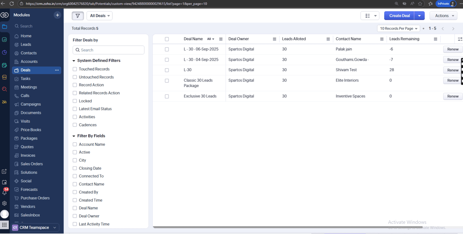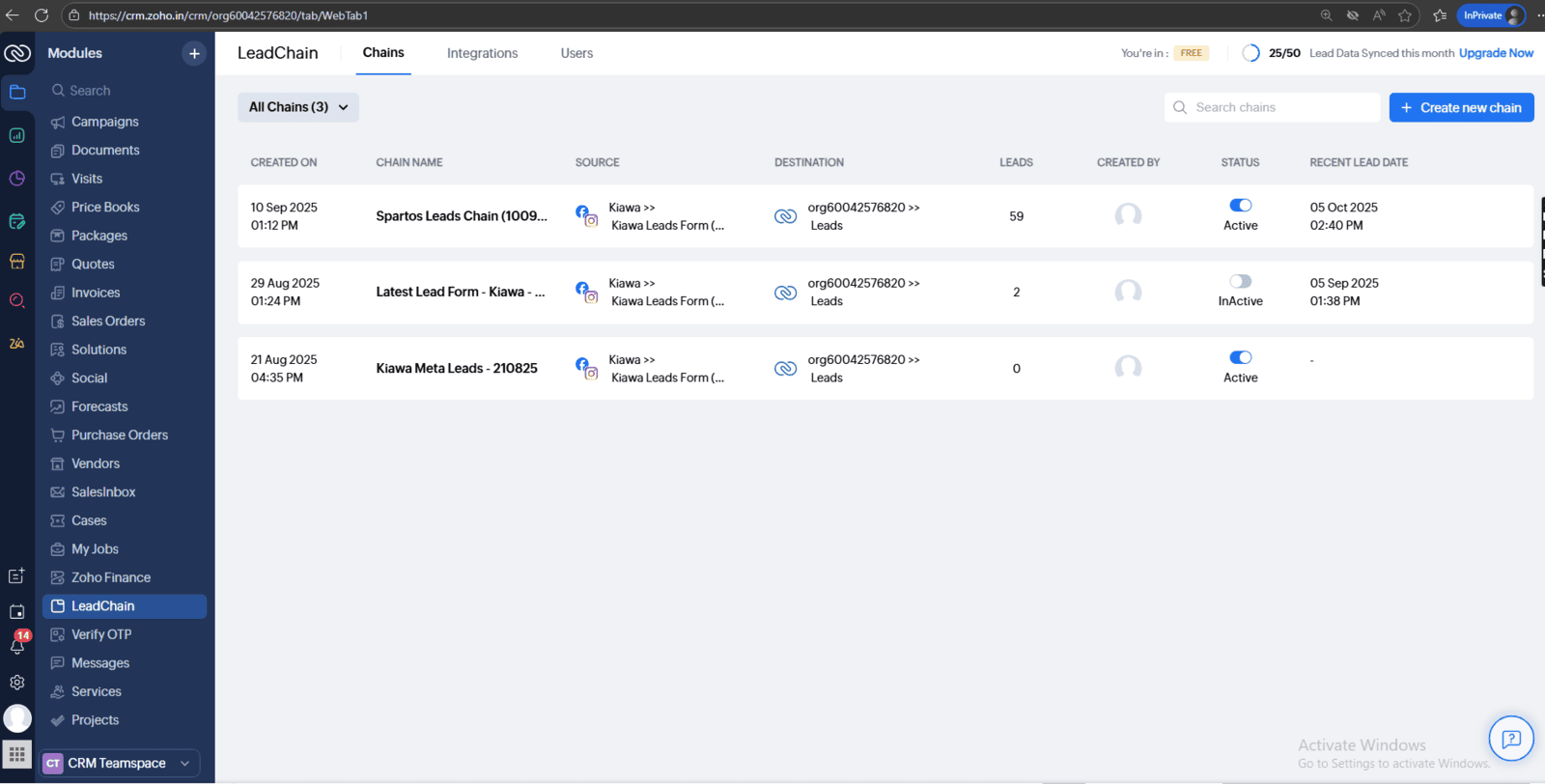 - Leads from Meta Ads or other ad platforms are captured via webhook/API/ LeadChain / Webforms and sent into the CRM system automatically.